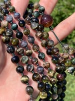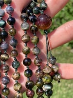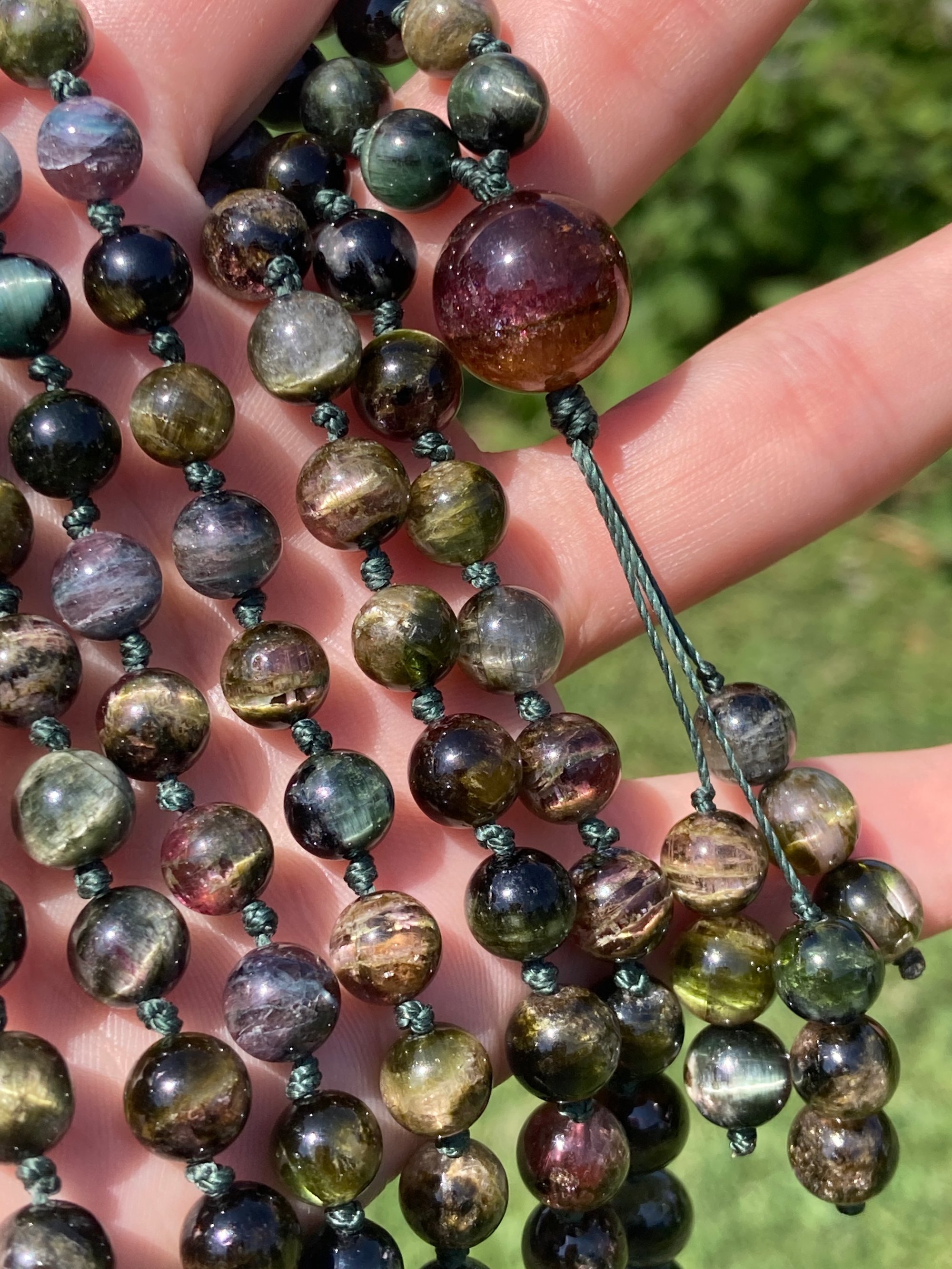 A brand new (to me) variety of rainbow tourmaline. There is an array of color, and most of the beads feature a cat's eye quality to them. The tourmaline beads are 7mm-7.5mm in size, and there is a 14mm pink and green tourmaline bead representing the guru bead. This mala has been lovingly hand knotted on nylon cord and finished with a variation of The Mala The Mission's signature three bead tassel. This is the exact mala you will receive.